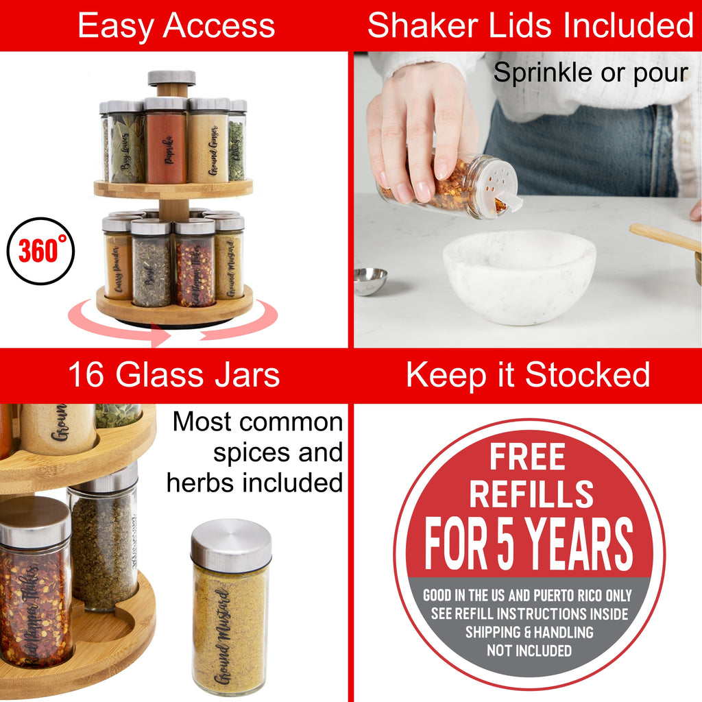 Enjoy 5 years of free spice refills, just pay shipping and handling. The Orii 2-Tier Bamboo Spice Rack is perfect for home chefs, cooking enthusiasts, or as a stylish and practical gift.