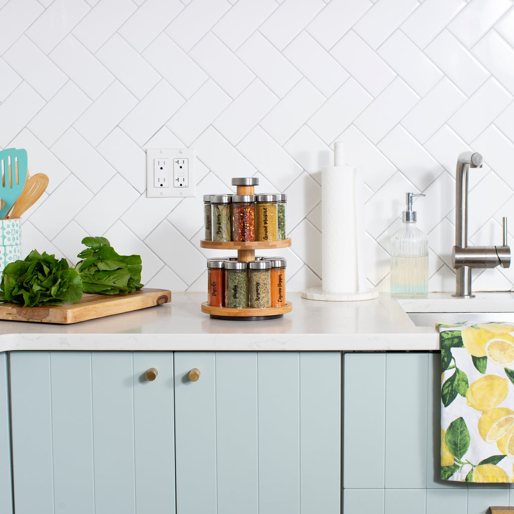 Organize your kitchen in style with the Orii 16-Jar 2 Tier Bamboo Rotating Spice Rack. Crafted from natural bamboo with a sleek stainless steel knob cover, this two-tier rotating rack keeps your spices neatly arranged, easily accessible, and beautifully displayed.
