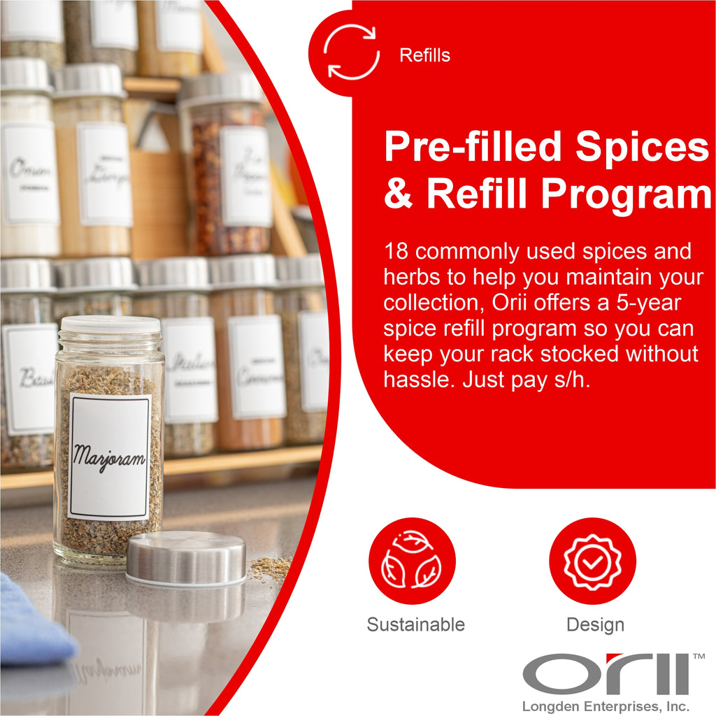 Enjoy 5 years of free spice refills, just pay only for shipping and handling. The Orii Bamboo Kitchen Organizer is a must-have for home chefs who value organization, sustainability, and a touch of natural elegance in their kitchen.
