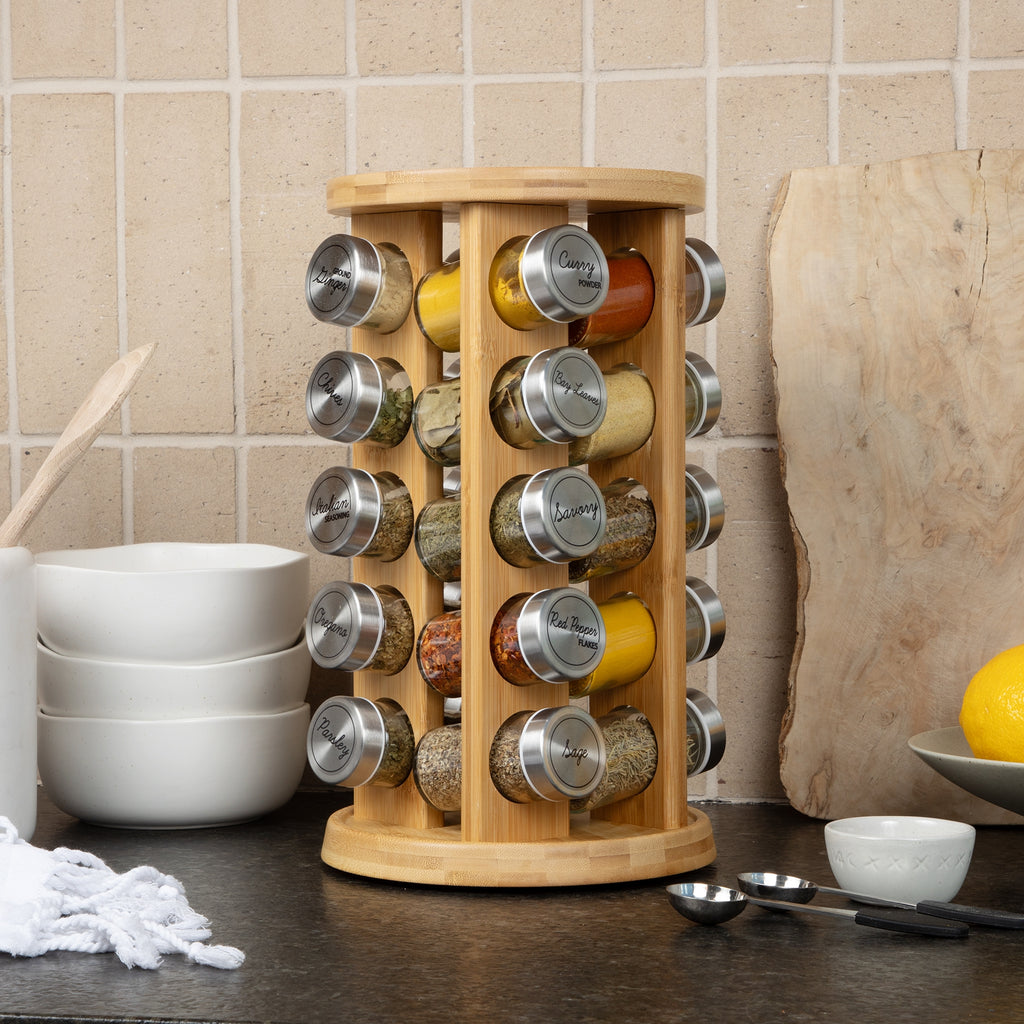 Upgrade your kitchen organization with the Orii 20-Jar Bamboo Rotating Spice Rack. Crafted from natural, sustainable bamboo, this elegant rack combines eco-friendly style with practical functionality, keeping your spices organized, visible, and easy to access.