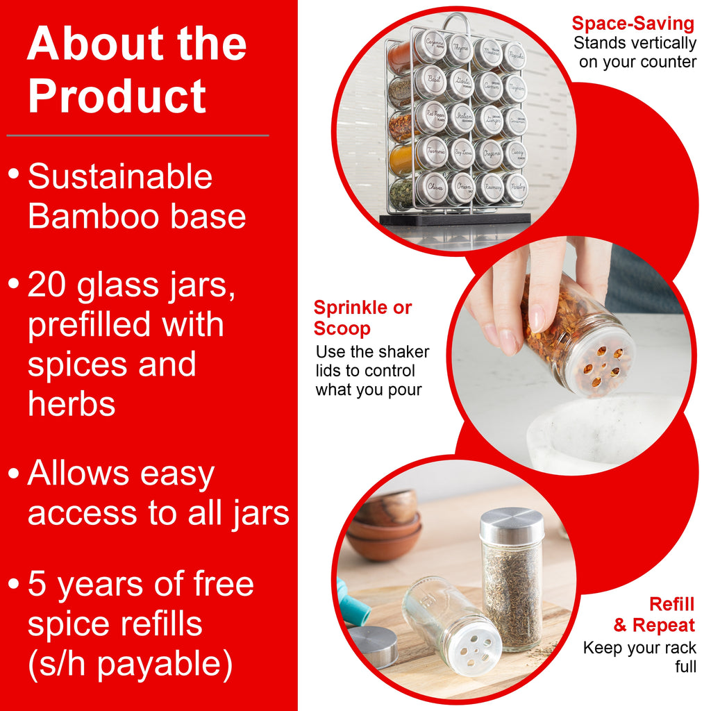 Each set includes 20 pre-filled glass spice jars, clearly labeled for quick identification and fitted with stainless steel lids and inner shaker tops for smooth dispensing. The rack also comes with 20 blank waterproof labels for custom organization and access to 5 years of free spice refills (shipping & handling apply within the continental U.S.).