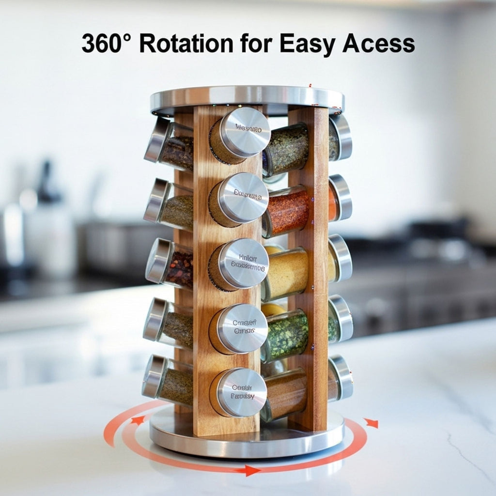 The 360° rotating Lazy Susan base ensures effortless access to your favorite seasonings, while 20 clear glass jars with etched stainless steel shaker lids keep your herbs and spices fresh, visible, and easy to use.