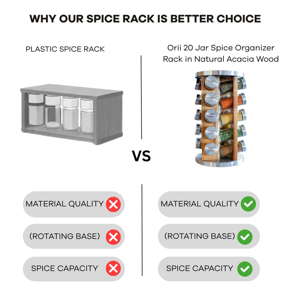 Upgrade your kitchen organization with the Orii 20-Jar Acacia Wood Rotating Spice Rack Organizer. The perfect blend of natural elegance and everyday functionality.