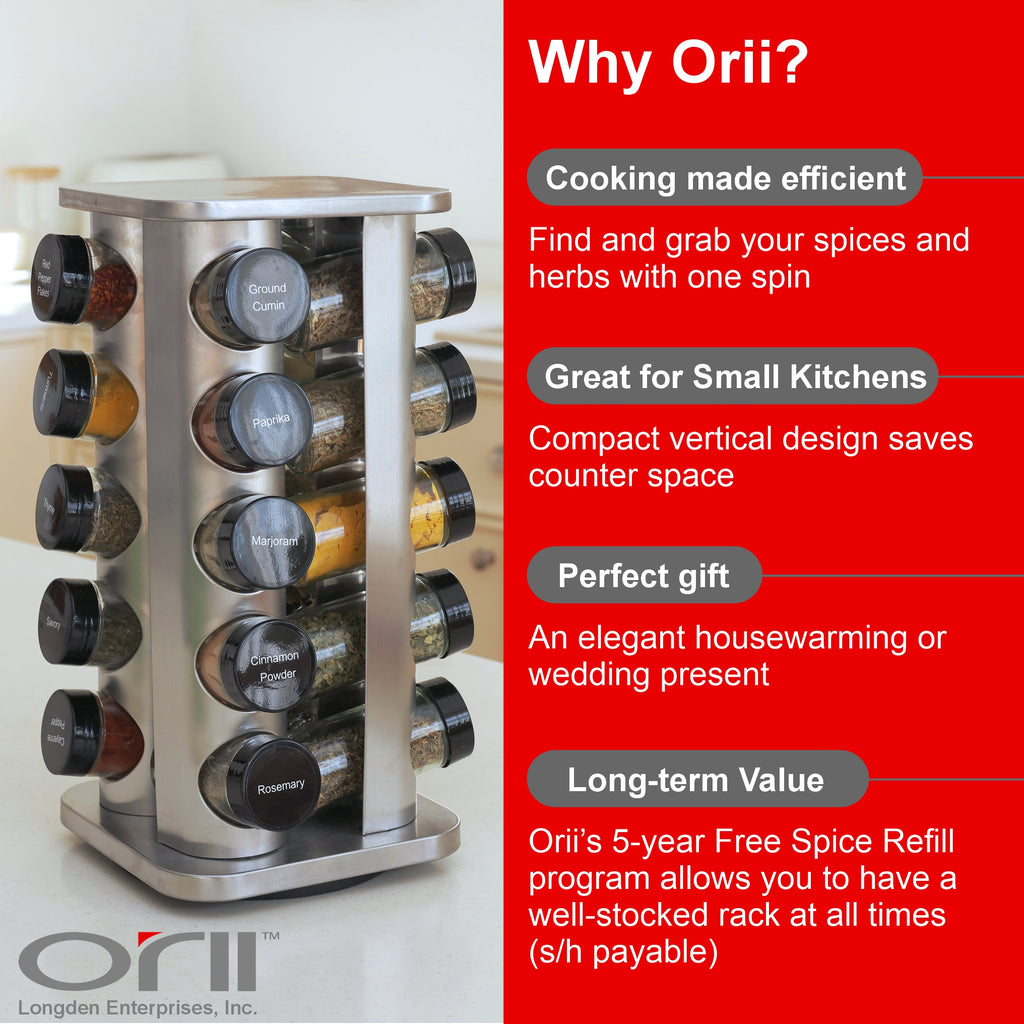 Keep your spices beautifully displayed, organized, and within easy reach with the Orii 20-Jar Stainless Steel Spice Organizer Rack, Where form meets function.