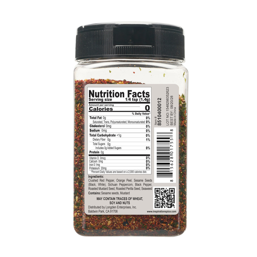 Chili Flakes, Orange Peel, Black Pepper, Black Peppercorn, Sesame Seeds, Mustard Seed, Seaweed
